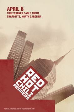This dynamic tour poster was designed to promote the Red Hot Chili Peppers’ multi-city tour, featuring stops in Orlando, Charlotte, Boston, and Washington D.C. The band’s iconic asterisk logo takes center stage, anchoring the design in a bold, circular composition. Radiating from each arm of the symbol are collaged skylines and landmark buildings from each tour city, creating a visually striking fusion of architecture and music. The color palette and gritty texture give the poster a bold, urban energy that reflects the band ’s raw, alternative spirit.
